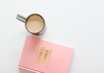 Planner for new years resolutions. Pink planner on a white desk.