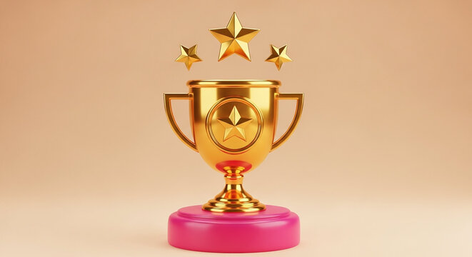 Gold trophy on a pink surface with eucalyptus, award, recognition