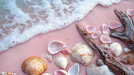 A serene coral beach features soft pink sands and gentle turquoise waves, adorned with unique shells and driftwood beneath a clear sky.