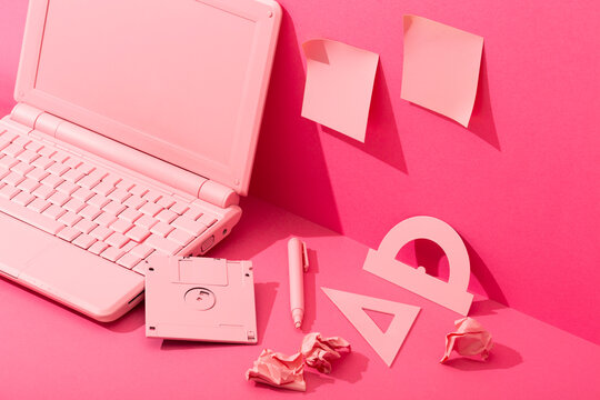Pink stationery and pink laptop on pink background, mess on desk office barbie style