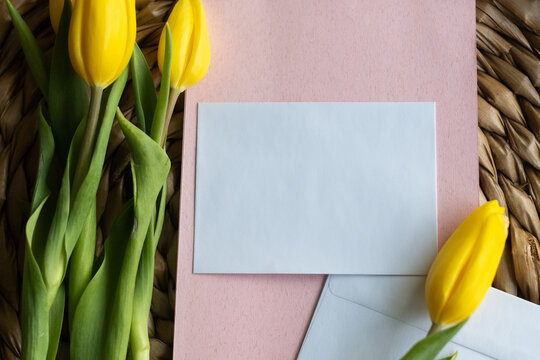 Soft pink stationery accented by two roses on warm wooden tabletop
