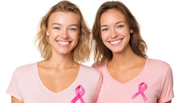 Smiling women wearing pink tops and breast cancer ribbons