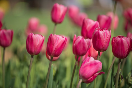 A close up image of pink tulips in a sunny garden with space for text. Creative banner. Copyspace image
