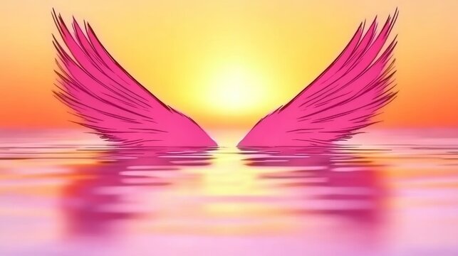 Pink wings rest on calm water at sunset. Peaceful and serene, the image evokes feelings of hope and freedom.