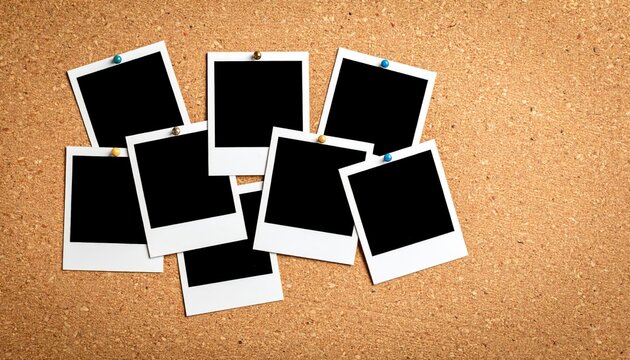Several three polaroid style blank photo frame prints with office index card pinned to cork notice board background