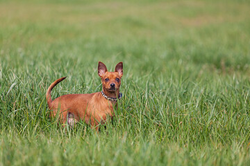 Sable brown and black and tan miniature pinscher portrait on summer time.  German miniature pinscher sitting outdoors on a wooden pier with green background. Smart and cute pincher with big funny ears