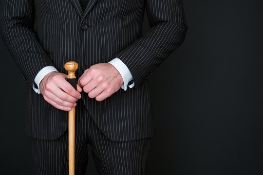 Man in pinstripe suit holding cane, Studio fashion portrait, Business classic style, Formal wear detail, Minimalist dark background, Copy space