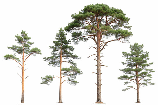 set of pinus sylvestris scotch pine spruce big tal isolated on white background, PNG.
