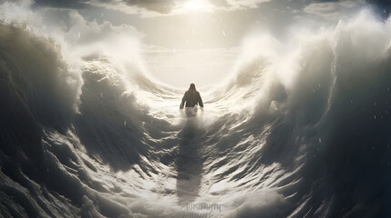 Jesus Christ walking on water. Storm with huge waves. AI generated