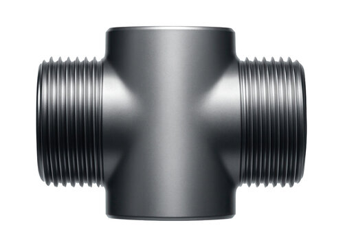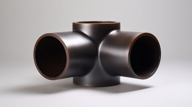 Industrial pipe fitting with bold orange cross on blue wood backdrop