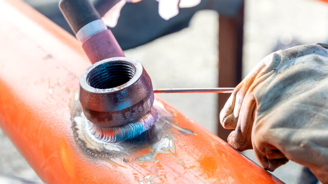 View of the weldolet fitting weld of the pipe with gas tungsten arc welding method. Weldolet is the kind of pipe fitting used to make a branch with the littler size of primary pipe.