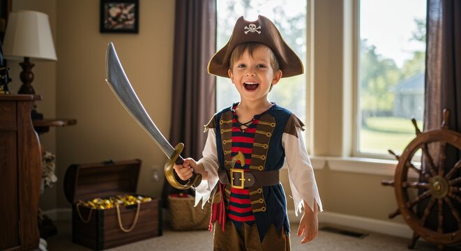 Little child boy in pirate hat and carnival costume playing with pirate ship toy in kid's room.