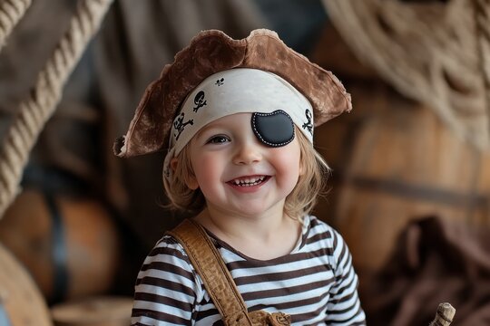 Adorable baby in pirate costume near wooden wall. Halloween concept