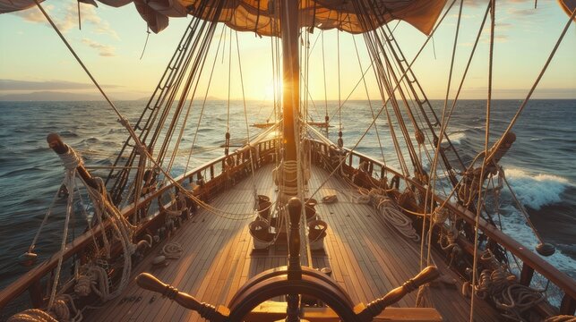 the ship's wheel of a pirate sailing vessel, gazing upon the expansive deck and vast open sea under the warm glow of a sunny day.