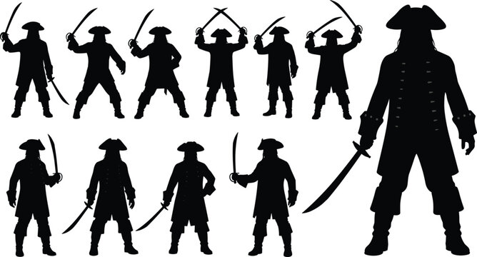 Pirate silhouette vector collection, sword holding pirate poses, captain character clipart, vintage costume outlaw design, old pirate illustration set