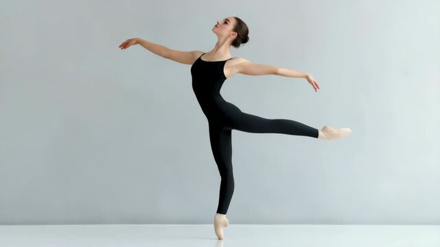 A female ballet dancer is performing a pirouette on a stage. She is wearing a black leotard and black leggings, and her arms are extended out to the side. The stage is white