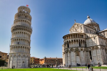 Leaning tower of Pisa, Italy with Basilica and Cathedral on a bright summer day