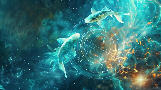 Pisces zodiac sign depicted in a sleek linear style on a dark polygon background