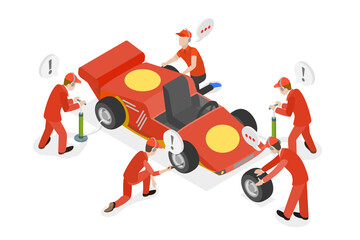 3D Isometric Flat  Conceptual Illustration of Pit Stop, Maintenance of a Racing Car