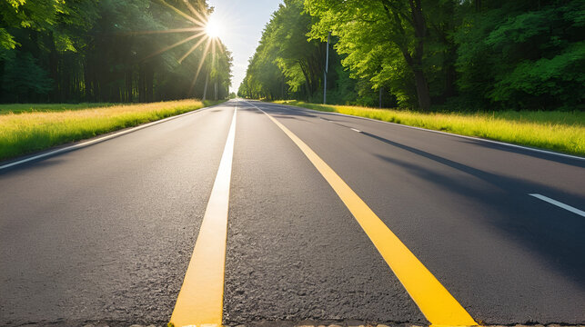 The image shows an empty asphalt road with a yellow line in the middle, surrounded by green trees. The sun is shining brightly, casting a warm glow over the scene.