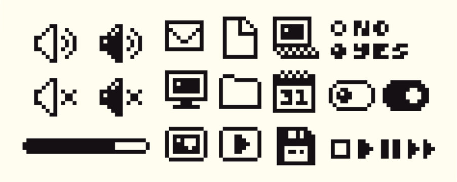 A collection of retro pixelated user interface icons. Creative digital assets for web and app design with a nostalgic 90s aesthetic for your DIY digital projects