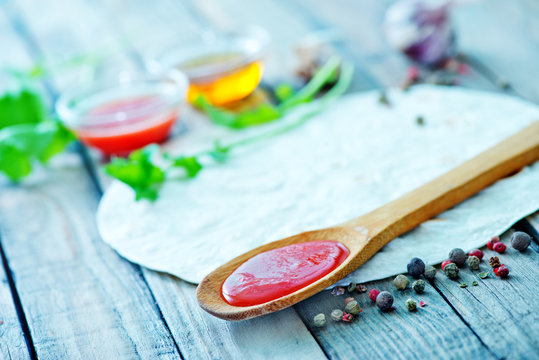 Baking pan with uncooked pizza dough crust before baking made with gluten free flour and woman hands adding tomato sauce with spoon flat top view