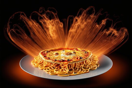 a plate of spaghetti with a sauce on it and a glowing light on the plate is a black background with a yellow glow on the plate and a black plate with a red light