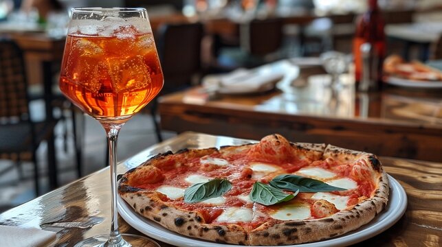 Baked Neapolitan pizza served with sparkling aperol spritz closeup image. Fresh mozzarella and basil piza close up photography. Italian food. Pizzeria concept photo realistic