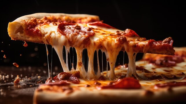 Delicious meat lovers pizza, cheesy, with pepperoni, ham, sausage