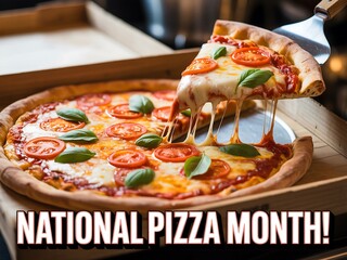 Delicious margherita pizza slice being lifted from a whole pizza celebrating national pizza month