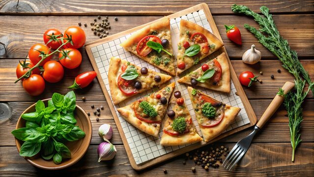 Freshly baked pizza slices stacked on a calendar, surrounded by utensils and herbs, against a rustic wooden background, representing pizza of the month subscription.