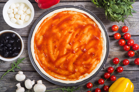 Fresh original Italian raw pizza preparation with fresh ingredients