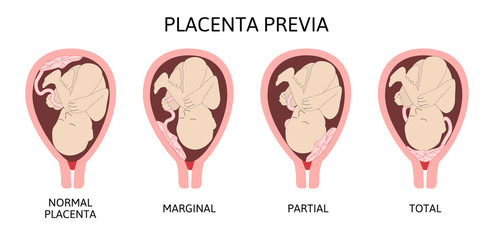 Different Placental Locations During Pregnancy. Major and Normal placenta previa, total and partial.