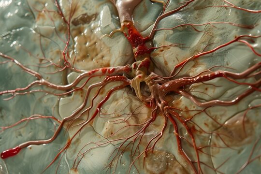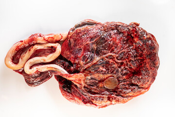 Closeup image of a human placenta and umbilical cord, showcasing the intricate blood vessel network