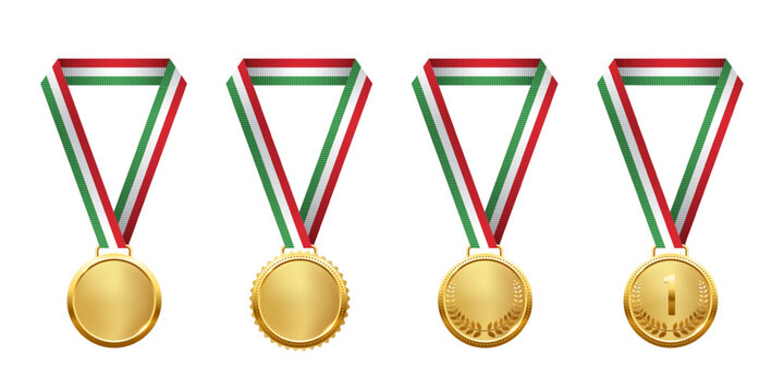 Golden medals set. Realistic 3D gold awards medals with ribbons and number one, symbolizing first place in sports, competitions, and athletic events. Vector illustration.