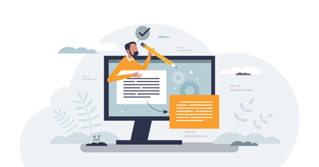 Paraphrasing tool with text conversion to different words tiny person concept, transparent background. Content restatement with online digital software service for plagiarism illustration.