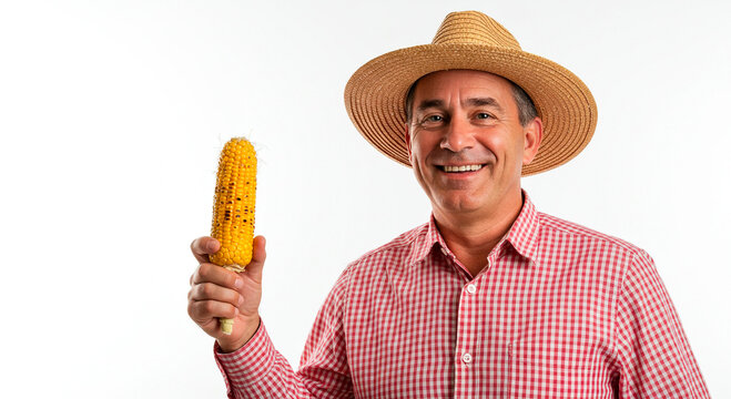 Smiling farmer holding roasted corn on the cob, wearing straw hat and plaid shirt against plain background, fresh harvest.