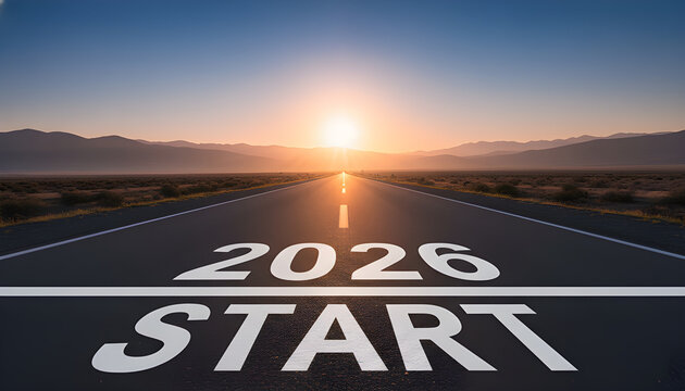 New year 2026 or start straight concept. word 2026 written on the road in the middle of asphalt road at sunset. Concept of planning and challenge, business strategy, opportunity and new life change
