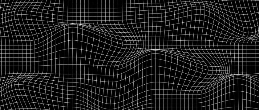 Distorted white grid on black background. Waved mesh texture. Fish net with curvatured effect. Checkered pattern deformation. Bented lattice surface