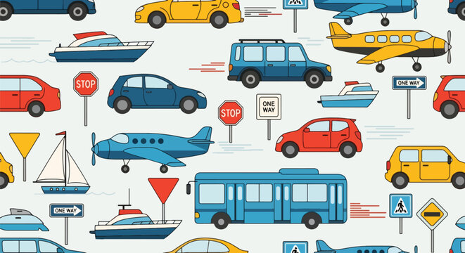 Flat vector seamless pattern with cars, planes, buses, and boats in vivid bright tones. Ideal for boys’ clothing, wallpapers, backpacks, and playful transportation themes