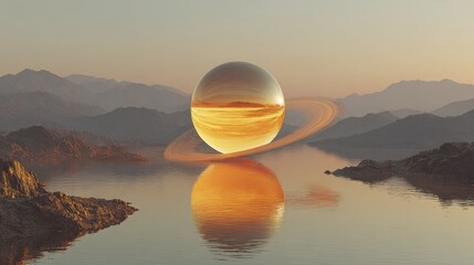 A floating, egg-shaped planetoid with rings rests in serene waters, against a hazy mountain backdrop