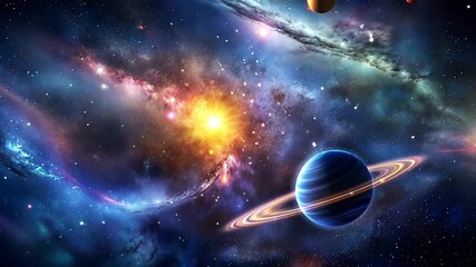 Animated journey through a colorful galaxy with planets and stars. Flying through a cosmic nebula in deep space. Science fiction and astronomy concept