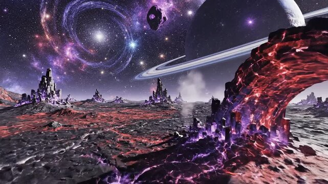 Alien planet landscape with strange rock formations and glowing structures under a cosmic galaxy with a ringed planet