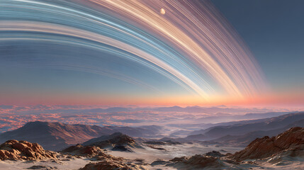 Stunning view from an alien planet with majestic rings in the sky. Mountains and clouds add depth to this otherworldly landscape. An inspiring image of cosmic beauty.