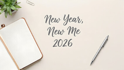 New Year, New Me: A minimalist workspace setting with an open journal, pen, and succulent, symbolizing new beginnings, personal growth, and fresh starts for the upcoming year 2026.