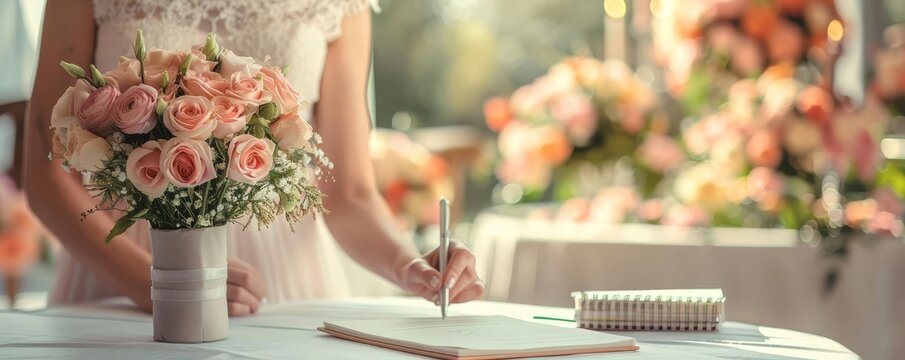 Wedding Planner Focus on a wedding planner organizing details with a notebook, with a wedding venue background, empty space left for text marry valentine