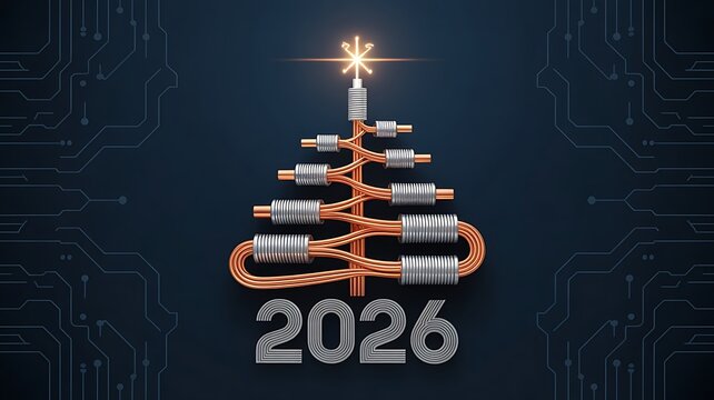 A symbolic Christmas tree laid out of a cable and a coil, 2026 New Year template, banner, poster on a power engineering theme, created with generative ai