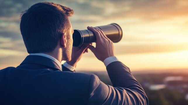 A businessperson looking through a telescope at a distant target, symbolizing long-term vision and strategic planning in the business environment.