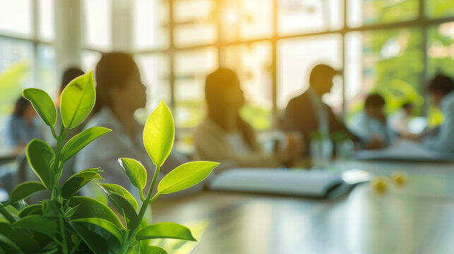 A potted plant sits on a sunlit conference table during a business meeting, symbolizing growth, focus, and a harmonious work environment.