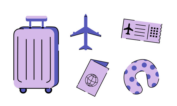 Travel and tourism icon set with purple luggage, airplane, boarding pass, and neck pillow on a white background. Travel essentials concept for design and print.